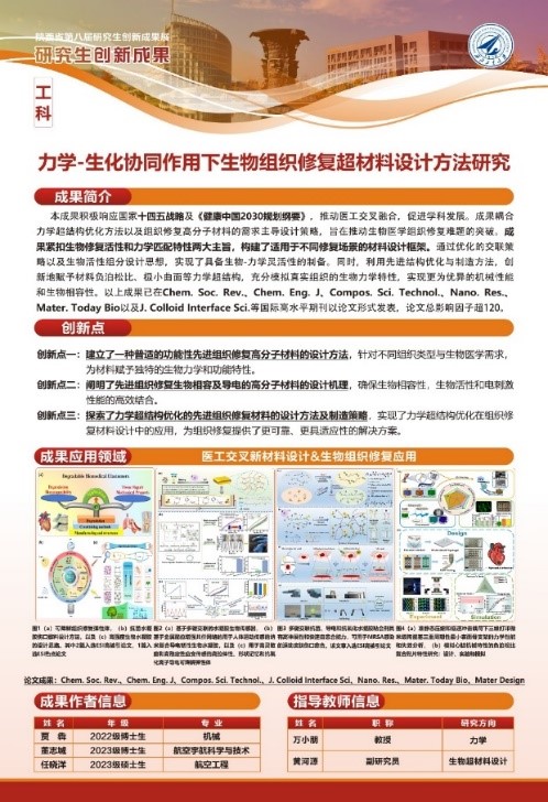 博士论文创新基金项目1项,以第一作者在《Chemical Society Reviews》(一区TOP,IF=43.2)、《Chemical Engineering Journal》(一区TOP,IF=14.3)、《Materials Today Bio》(一区TOP,IF=10.8)、《Journal of Colloid and Interface Science》(一区TOP,IF=9.9)、《Composite Structures》(一区TOP,IF=6.3)等本领域国际顶尖期刊上发表多篇学术论文,3篇入选ESI高被引论文,1篇入选Hot Paper、获得国家授权发明专利一项。