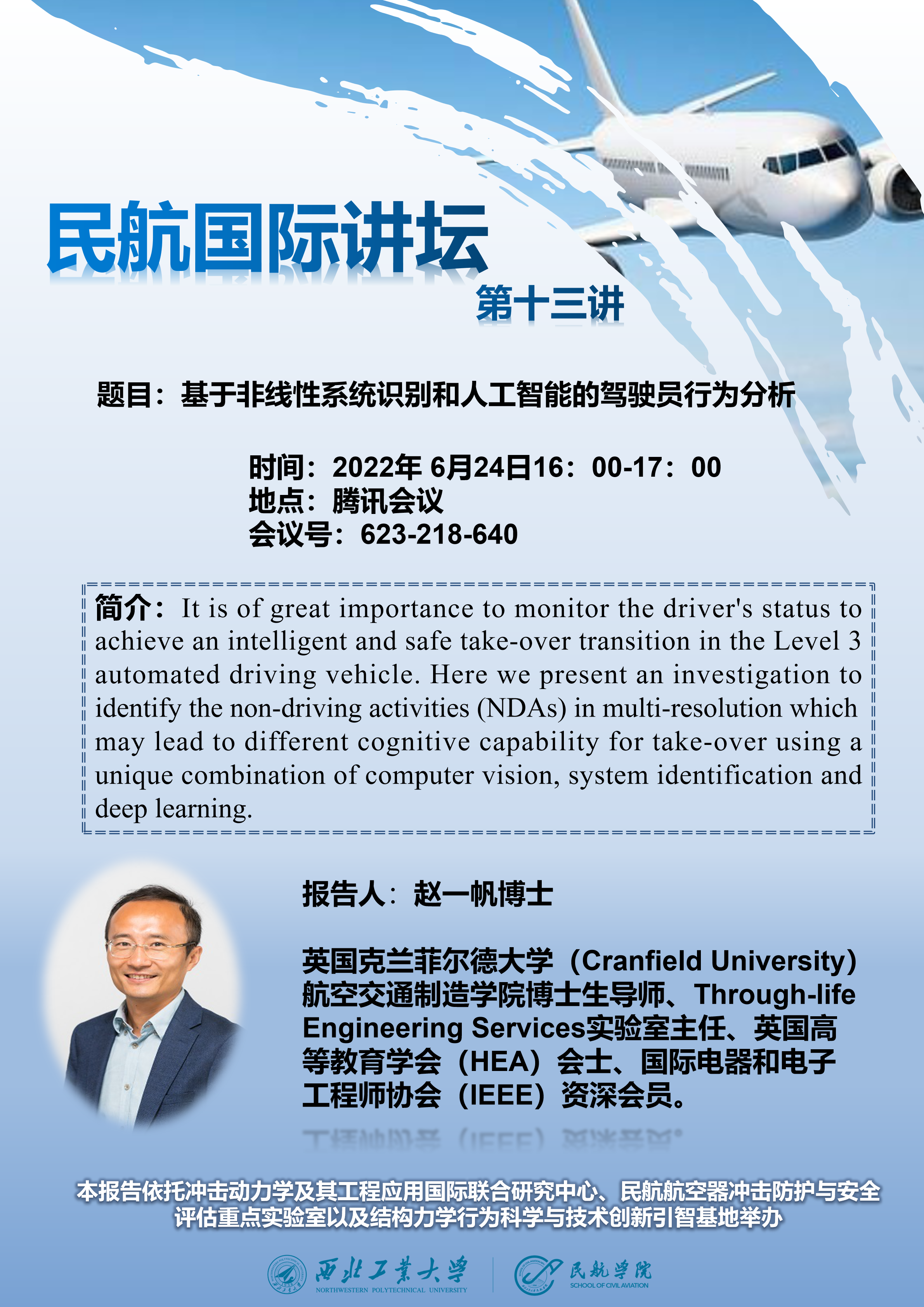 6月24日下午四点,同人小说 拟线上举办“基于非线性系统识别和人工智能的驾驶员行为分析”专题讲座,届时欢迎各位老师同学参会交流。报告信息如下: