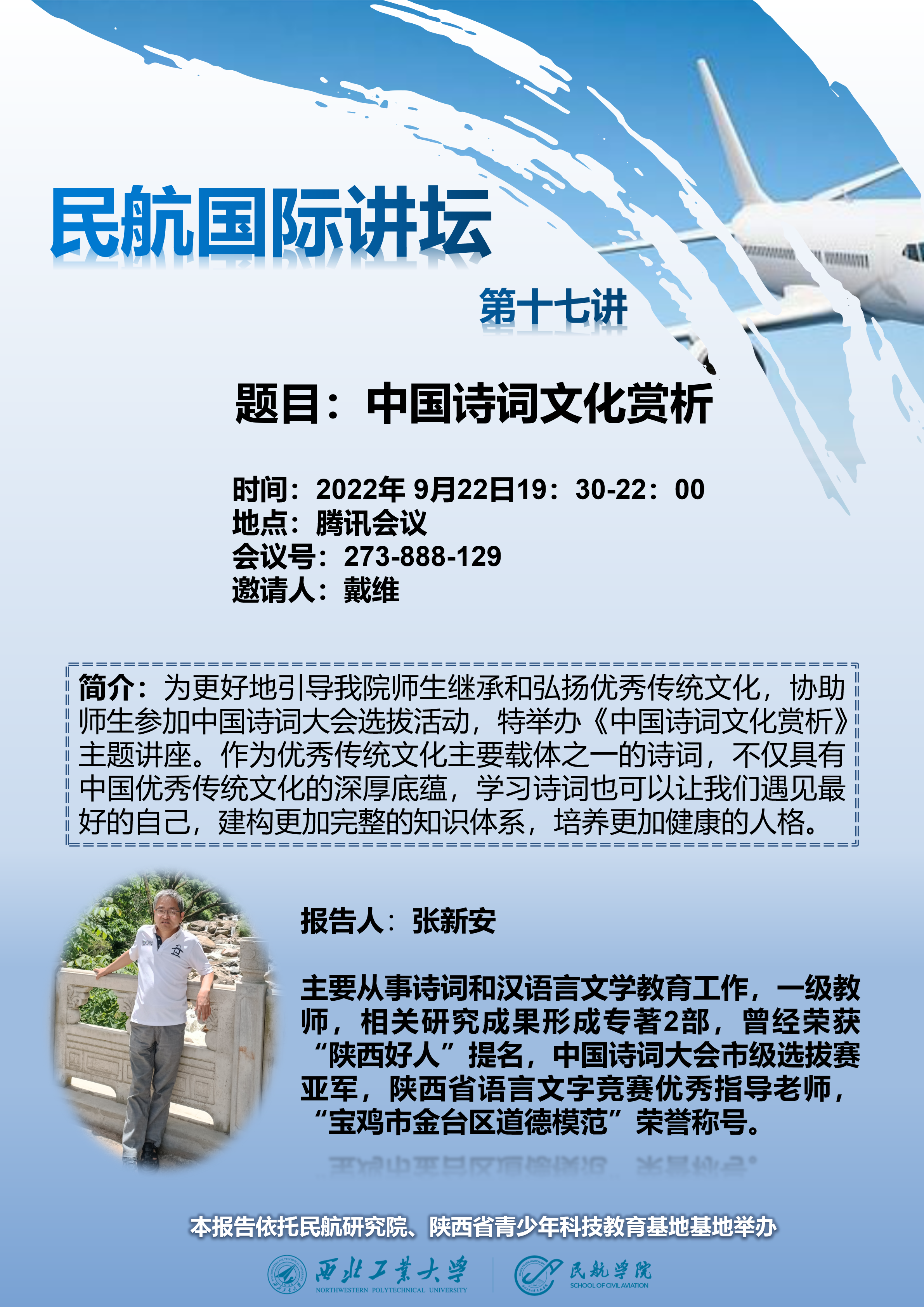 9月22日晚七点三十分,同人小说 拟线上举办“中国诗词文化赏析”专题讲座,届时欢迎各位老师同学参会交流。讲座信息如下: