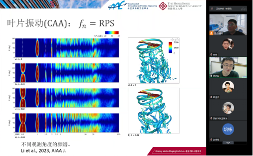 讲座中,钟思阳博士向与会的师生简要介绍了香港理工大学和航空及民航工程系的基本情况,然后结合他本人气动噪声的研究兴趣,重点介绍了城市空中交通领域旋翼飞行器降噪的背景与需求,以及近期在旋翼气动噪声理论建模与噪声预测问题中的突破与进展。钟思阳博士从气动噪声建模框架着手,介绍了考虑非定常和不确定因素的理论分析方法,讨论了转速波动、叶片振动等因素对噪声特性的影响,为实际复杂因素条件下的旋翼噪声精准预测提供了思路。
