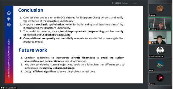 副教授闫浩的邀请,为民航国际讲坛作题为“考虑起飞不确定性的机场滑行道联合调度问题研究”线上讲座,学院多名师生参加了此次讲座,讲座由闫浩主持。
