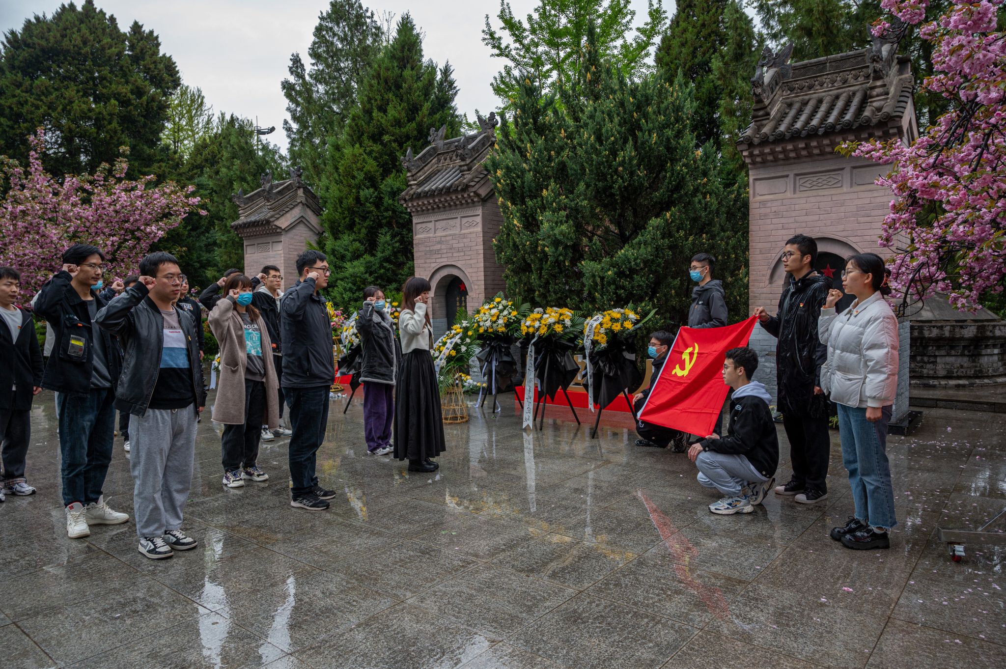 张睿:虽然阴雨蒙蒙,凉风清冷,但莘莘学子庄严肃穆,面对一座座丰碑,自发默契地默哀,是我们对先辈英勇奉献的崇高致敬,也许这就是早期共产党人的血脉精神。重温入党誓词,不忘初心,牢记使命,传承先辈们的革命精神!我们的崇敬寄托于黄菊,向永垂不朽的人民英雄致敬。