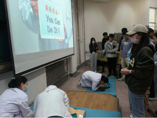 在理论学习后,学生们分成小组,进行实际操作演练。在各位医生的带领下,学生们依次进行了心肺复苏的模拟演练。
