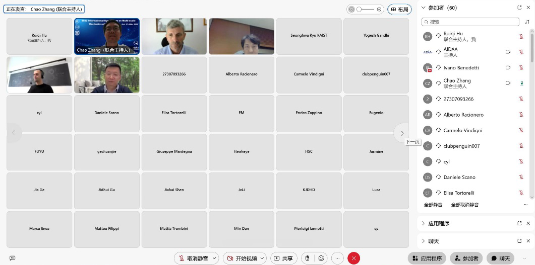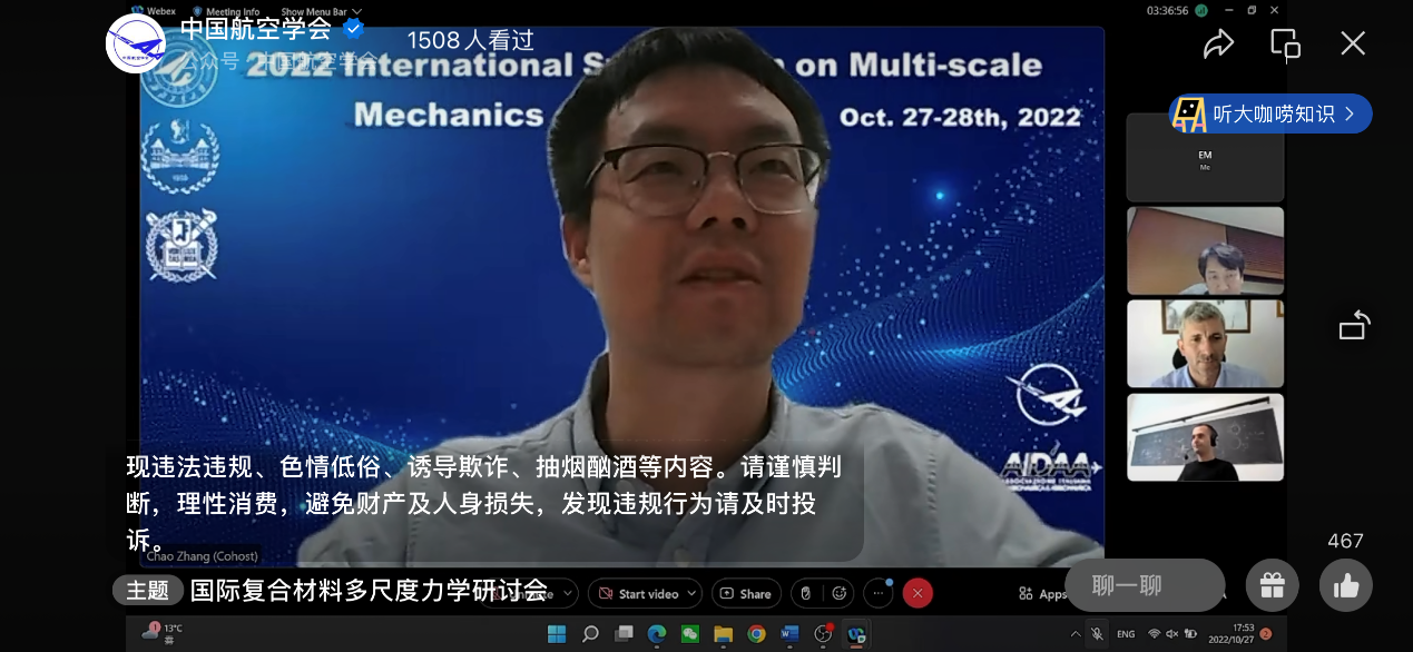 联合意大利都灵理工大学、韩国首尔国立大学共同主办的2022复合材料多尺度力学国际学术研讨会线上举行并通过中国航空学会微信视频号同步直播。来自多个国家的70余名专家学者线上参会,其中国外学者30余名;1500余人通过直播平台参会。