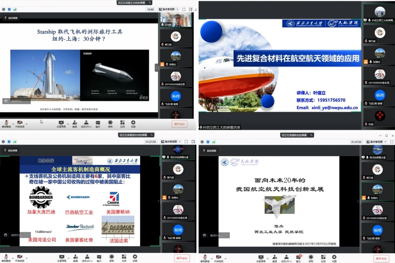于2022年1月4日14:00,在腾讯会议线上举办了本科生系列讲座第一讲,近 200名本科生线上参加了讲座。“民用航空发动机设计理念与技术发展”、“先进复合材料在航空航天领域的应用”、“大飞机总体技术发展”、“航空航天未来二十年发展”先后由王光秋教授,叶信立副教授,党庆庆助理教授以及陈杰副教授主讲,学院教学副院长张晓化主持。